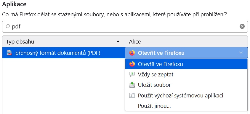 FF: Nastavení > Obecné > Aplikace a tam si nastav pro PDF Adobe.