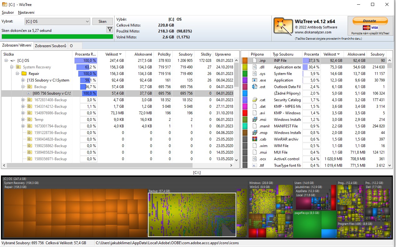mám notebook Dell RAM 8Gb, 64bit OP, Intel Core i7-4510U CPU 2.00 GHz 2.60GHz s widows 10 home. Velikost disku 220 Gb . V notebooku nemám žádné fotky, videa, hudbu, hry, zbytečné aplikace. Už nevím co mám smazat. Mám pouze 4Gb volného místa. Na úložišti mi to ukazuje že 133 Gb je v ostatních a v Apps & Features 37 Gb - pokud to rozkliknu tak mi to ukazuje NVIDIA 728Mb a Drivers 462Mb, Apps 10Mb pak už to jsou Kb. Moc tomu nerozumím, protože součet mi nějak nesedí. Proč je to 123Gb když to ukazuje daleko méně v rozpisu. Zkoušel jsem čištění disku, smazal jsem stažené, koš, vše co šlo, ale prostě najednou není místo, pouze 2GB. Posílám printscreen z diskanalyzeru. Děkuju moc