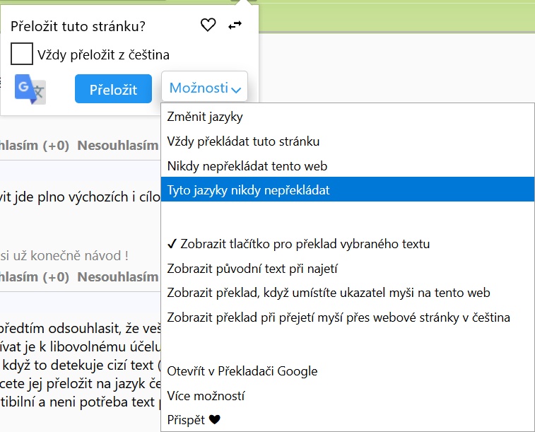 Prohlížeč se s tím vnucuje, dá docela práci to zrušit. Je teda potřeba předtím odsouhlasit, že veškeré překládané texty budou patřit googlu a ten podle nich bude cílit reklamu a používat je k libovolnému účelu (což jsem samozřejmě odmítnul), ale jinak by to mělo fungovat samo pokaždé, když to detekuje cizí text (včetně slovenštiny, což je obzvlášť komické (detekován jazyk slovenština, chcete jej přeložit na jazyk čeština)), gůgl by si už měl zapsat za uši, že čeština a slovenština jsou navzájem kompatibilní a neni potřeba text prznit strojoovým překladem.
