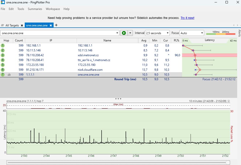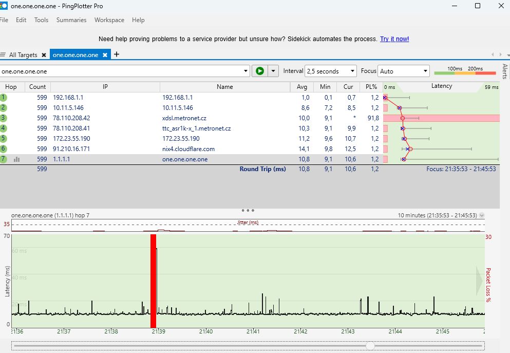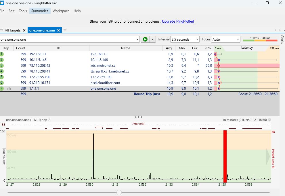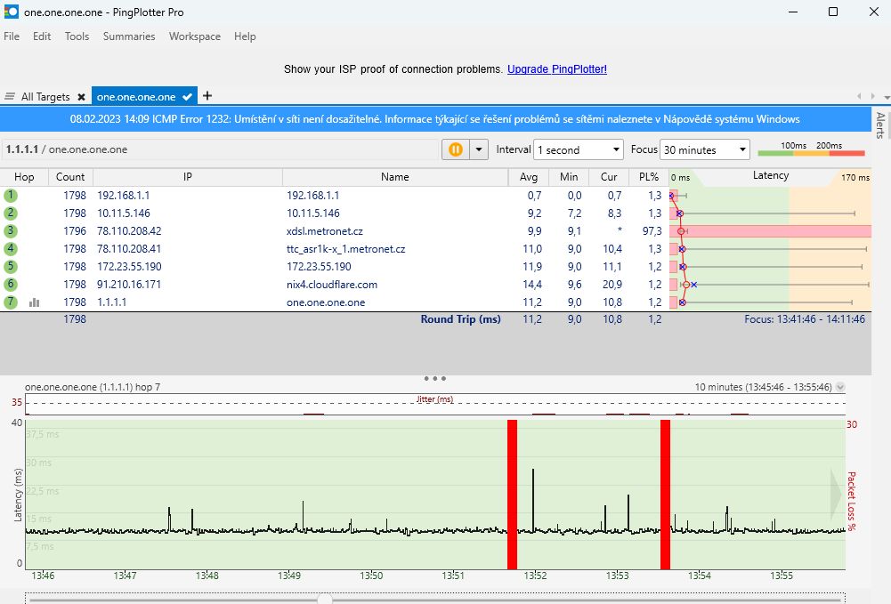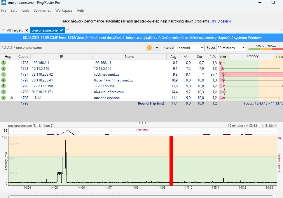 Následně jsem si vedle PC postavil notebook, připojil ho kabelem do routeru a na obou zařízeních spustil Pingplotter na cloudfare. Zatímco na notebooku se za cca půl hodiny nevyskytl ani jeden výpadek, u PC se objevily tři.