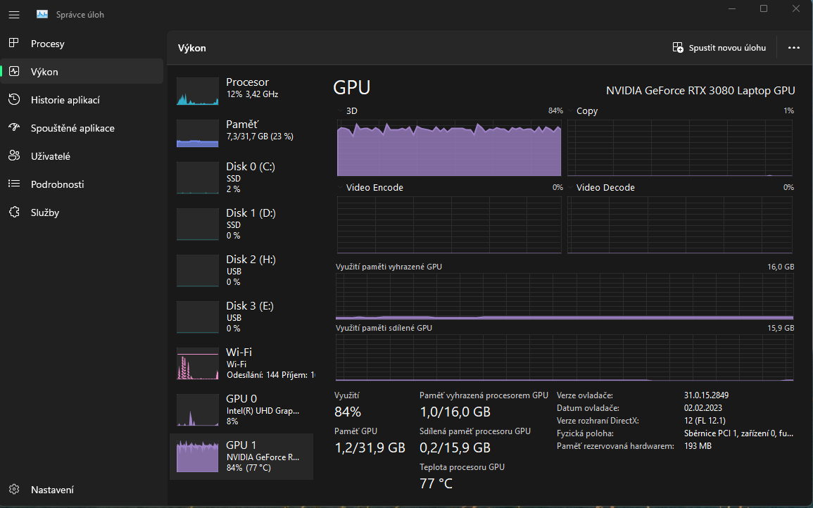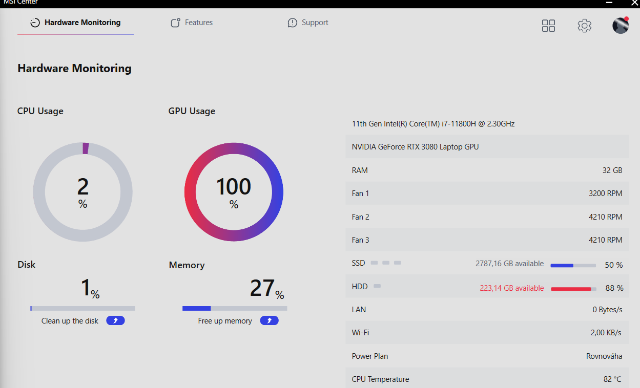 Ahoj, mám notebook MSI GS66 Stealth s i7-11800H a RTX3080. Notebook začal zničehonic více hřát a hučet (chladit), po prozkoumání jsem zjistil že jeden grafika na 100% v aplikaci od MSI, v správci úloh je to kolem 80-90%. Tohle vytížení jeden ihned po startu PC. Když hraju např. WOT tak grafika běží dle toho jestli jsem v menu (cca 30%), ve hře mnohem více. V momentu kdy hru vypnu, okamžitě vyběhnou prvně zmiňované hodnoty. Udělal jsem aktualizaci grafiky, Win (11), což samozřejmě nepomohlo.