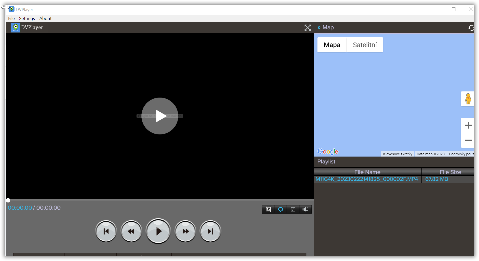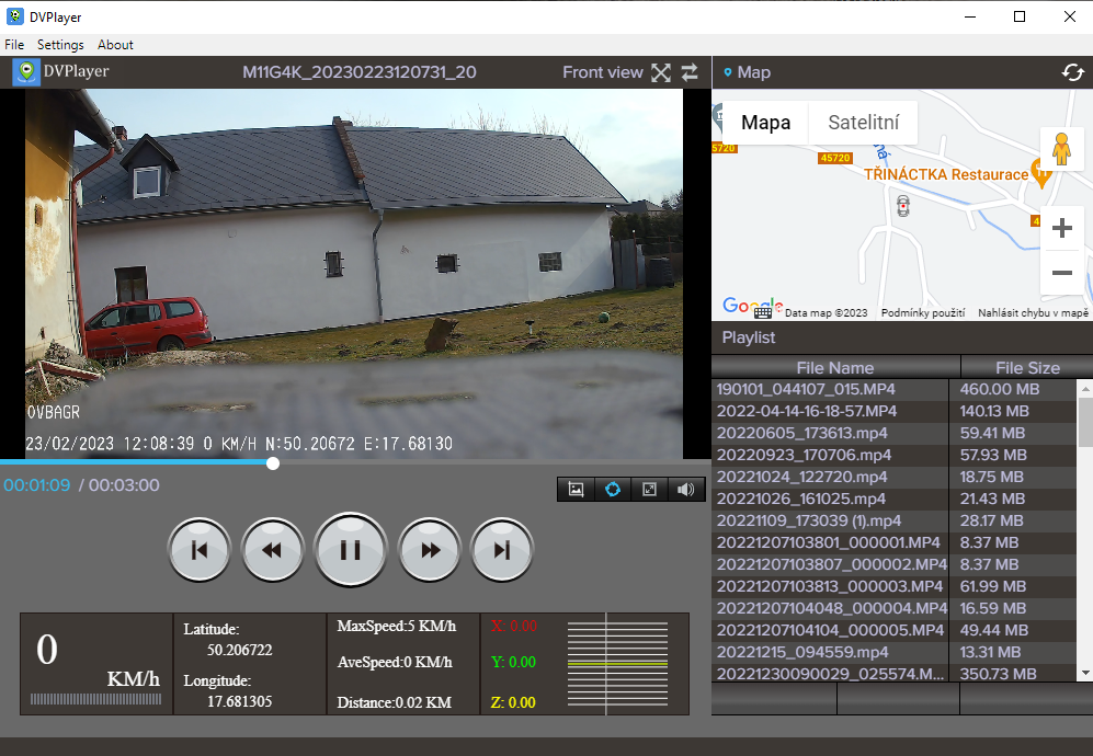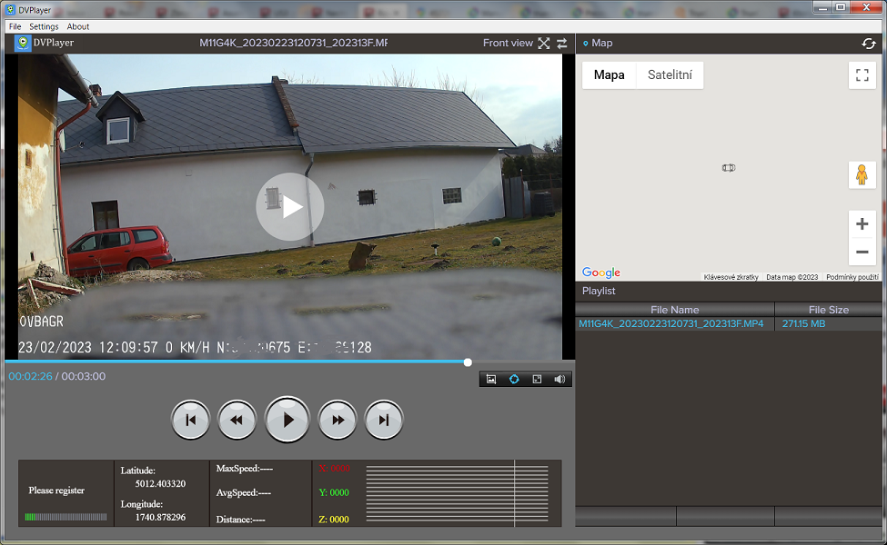 Tak to video přehrává i se zvukem, ale okno s mapou zůstává prázdné a šedé, je tam jen kresba autíčka která jde posunovat, ale mapa žádná. Podle návodu se ale ten DVPlayer musí při prvním spuštění zaregistrovat, takže proto mi to asi nejde. Zkus ještě aktualizovat ten GPS modul přes USB kabel v PC dle manuálu bod 5. nebo tady. Ale alespoň to pod videem ukazuje souřadnice a rychlost. Souřadnice jsem částečně umazal já, aby ti ctitelky z poradny nelezly až do baráku.