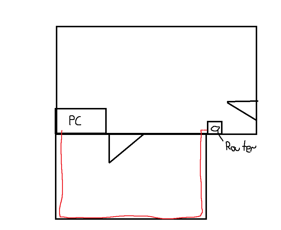 Vždyť píšeš, že je PC a router v jedné místonost, tak kam chceš vrtat "skrz dvě stěny"?