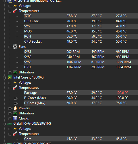 Dobrý den, měřil jsem teploty v PC. Obecně se mi teploty zdají v pohodě. Ale u procesoru mi občas připadá, že někdy teplota na vteřinu vyvskočí vysoko a hned se zase vrátí zpátky. Více je to vidět v zátěži, viz obrázek, kdy u procesoru v řádku Package je teplota 67° a sloupec max ukazuje třeba i 100°.