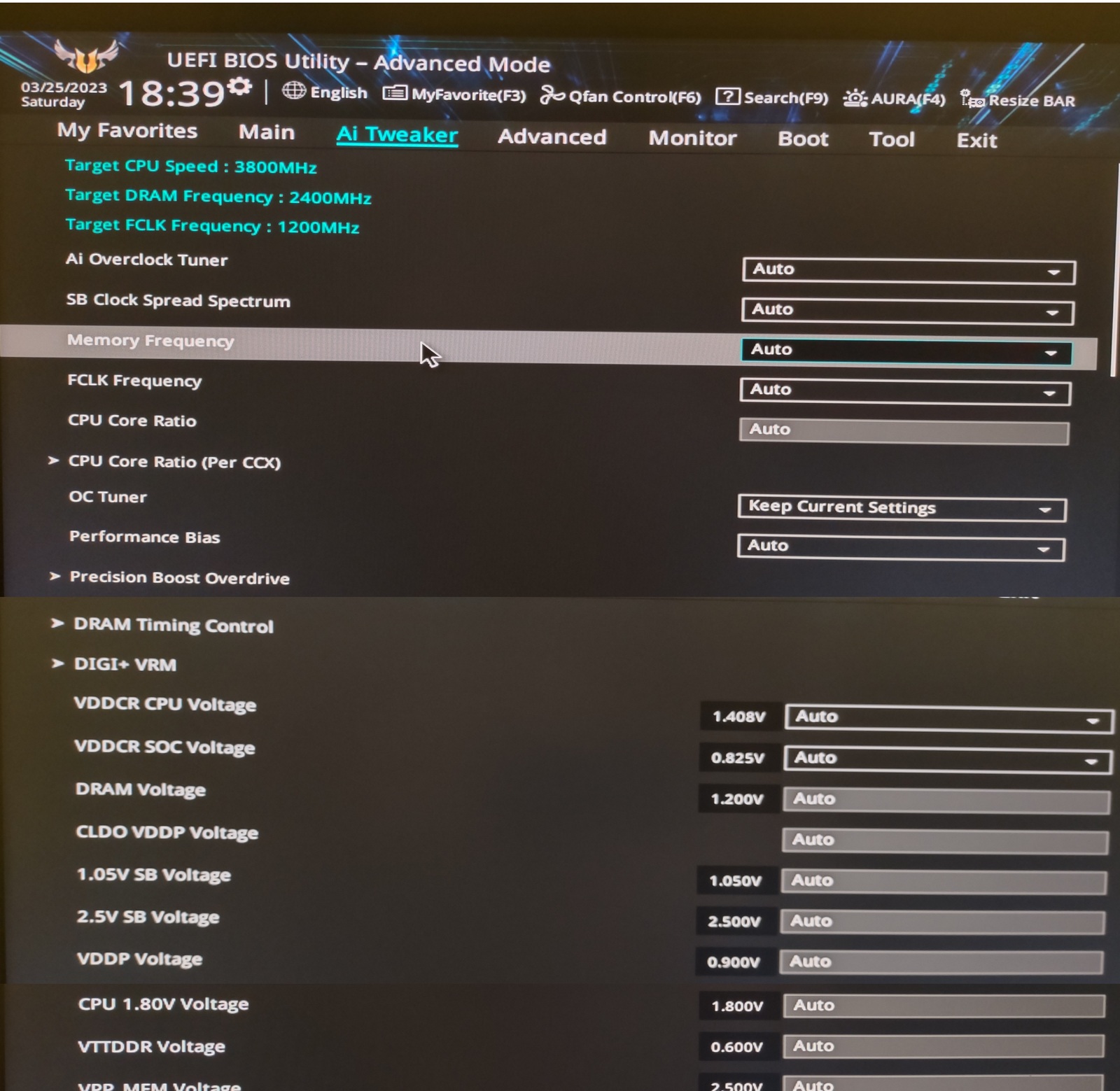 V BIOS je všude v menu AI Tweaker hodnota Auto a výsledný kmitočet je nastaven na 2400MHz. Proč tomu tak je, nevím. Když jsem ručně nastavil kmitočet v řádku Memory Frequency na 3600, tak po uložení konfigurace a restartu zůstává stále na hodnotě 2400. Jiné místo v menu, které by na první pohled mělo vazbu na kmitočet pamětí jsem nenašel.