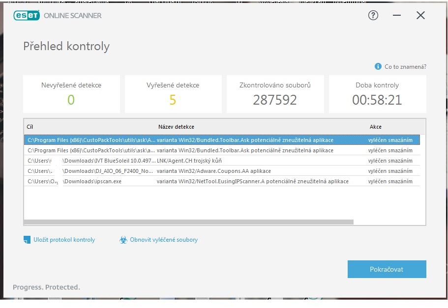 Já bych si potřeboval proklepnout tento notebook na viry když kliknu na ten odkaz https://www.eset.com/int/home/online-scanner/ na tlačítko ONE-TIME SCAN tak mě to chce stáhnout https://download.eset.com/com/eset/tools/online_scanner/latest/esetonlinescanner.exe když to stáhnu tak mě se instaluje nějaký program ? já to potřebuji jen jeden krát a ne aby mě pak to po mě chtělo nějaké prachy nebo takto jaká mi s toho plyne hrozba ? díky