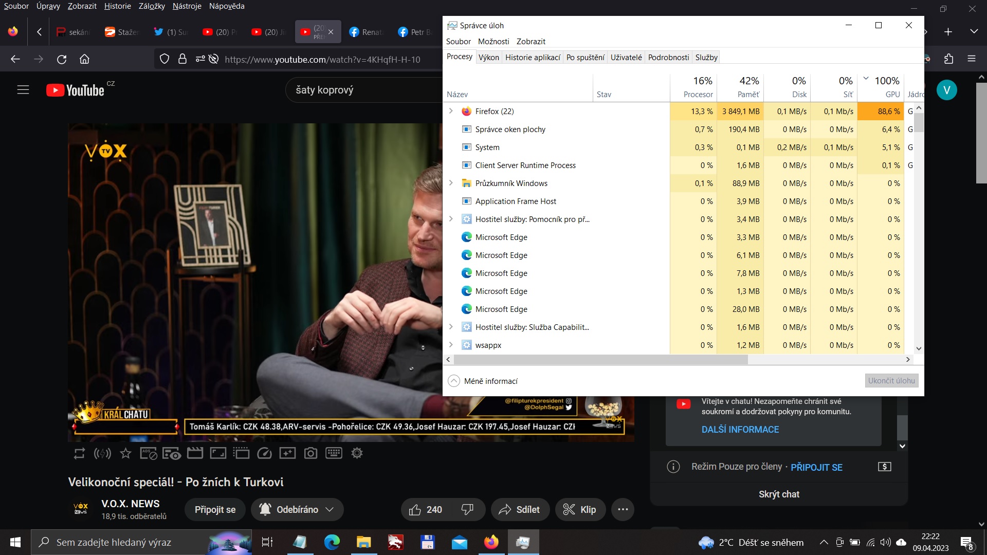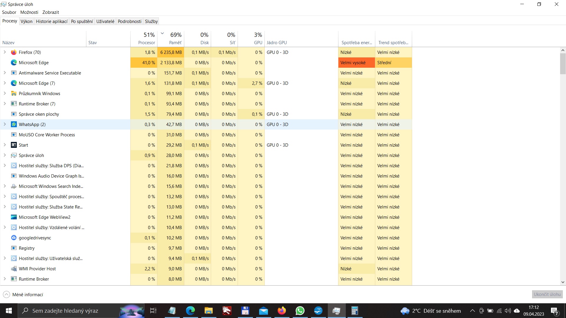 Proč máš spuštěný Edge a zároveň Firefox? Nechápu. Jasně tam vidíš vytížení, že Edge si pro sebe bere 41% výkonu procesoru a Firefox zase 6GB paměti.