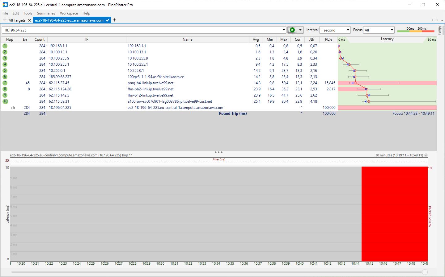 Tak je to zřejmě problém peeringu mezi ISP a další cestou ven do internetu (síť twelve99) a další velký rozptyl je mezi twelve99 směrem do AWS (to sice není červený, ale max a jitter jsou také hodně velké).