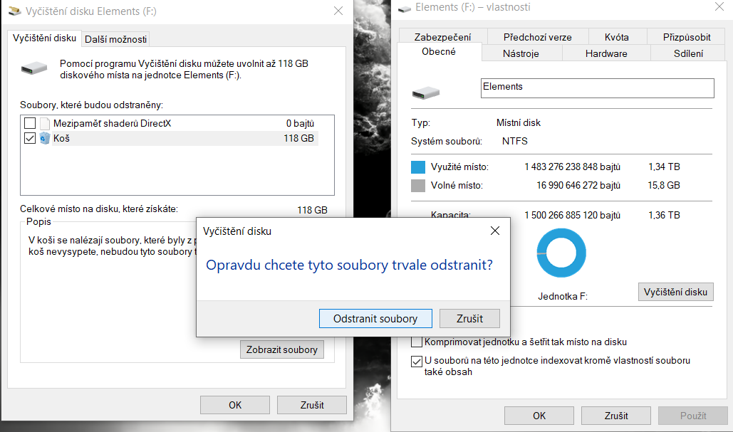 Zdravím. Promazával jsem dnes svůj externí HDD disk. Jako vždy jsem vybrané položky značila přesunul do koše. V koši jsem je pak odstranil pomocí příkazu "Vysypat koš" nebo přes shift+del. Tentokrát to bohužel nefunguje. Když jsem v koši soubory nemohu odstranit příkaz "Vysypat koš" se tváří, že funguje, ale soubory tam i přesto zůstanou a na disku se neuvolní žádné místo. Pokoušel jsem se tedy soubory obnovit nebo přemístit, ale to zahlásí akorát, že soubory se již v koši nenachází. Takže se mi teď doslova někde toulá 108 GB dat, které se mi nedaří odstranit. Mátě někdo zkušenosti, jak se s tímto vypořádat ? Děkuji. Zvlášní také je, že pokud externí HDD odpojím z koše veškeré položky a soubory zmizí. V příloze zasílám postupně za sebou screenshoty mých pokusů.