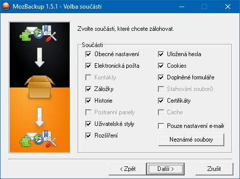Já to myslel tak, že MozBackup v ZIP verzi je také v angličtině, takže oproti EXE instalačce žádný rozdíl, snad jenom v tom, že po rozbalení lze vyměnit soubor default.lng za jiný, český, takže pak už jde instalace a ovládání česky. To mi jako moc user friendly nepřijde, když různé programy zahraničních autorů, třeba Tebou vzpomínané správci souborů, mají na výběr češtinu hned při instalaci.