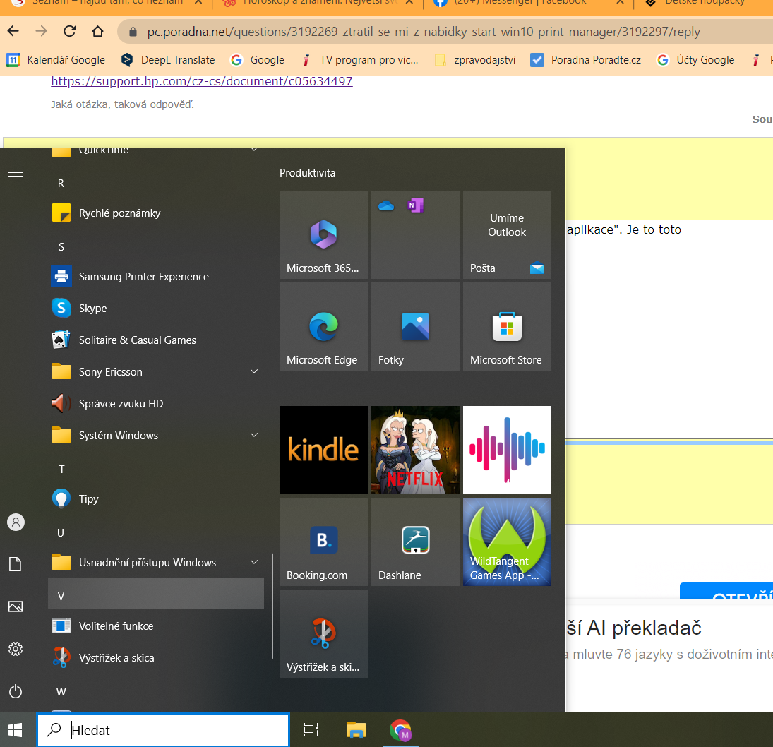 V obou napovědach pro Win10 mě nabádají že mám jít na "Všechny programy", nebo "Všechny aplikace". Je to ono (viz. příloha), je to asi blbé, ale nevím co jiného si představit pod teni dvěma souslovími. Pokud ano, tak v tom případě pod S jen toto (viz. příloha) a Print Manager taky není, když dam hledat, háže mě to na internet. To asi není správné.