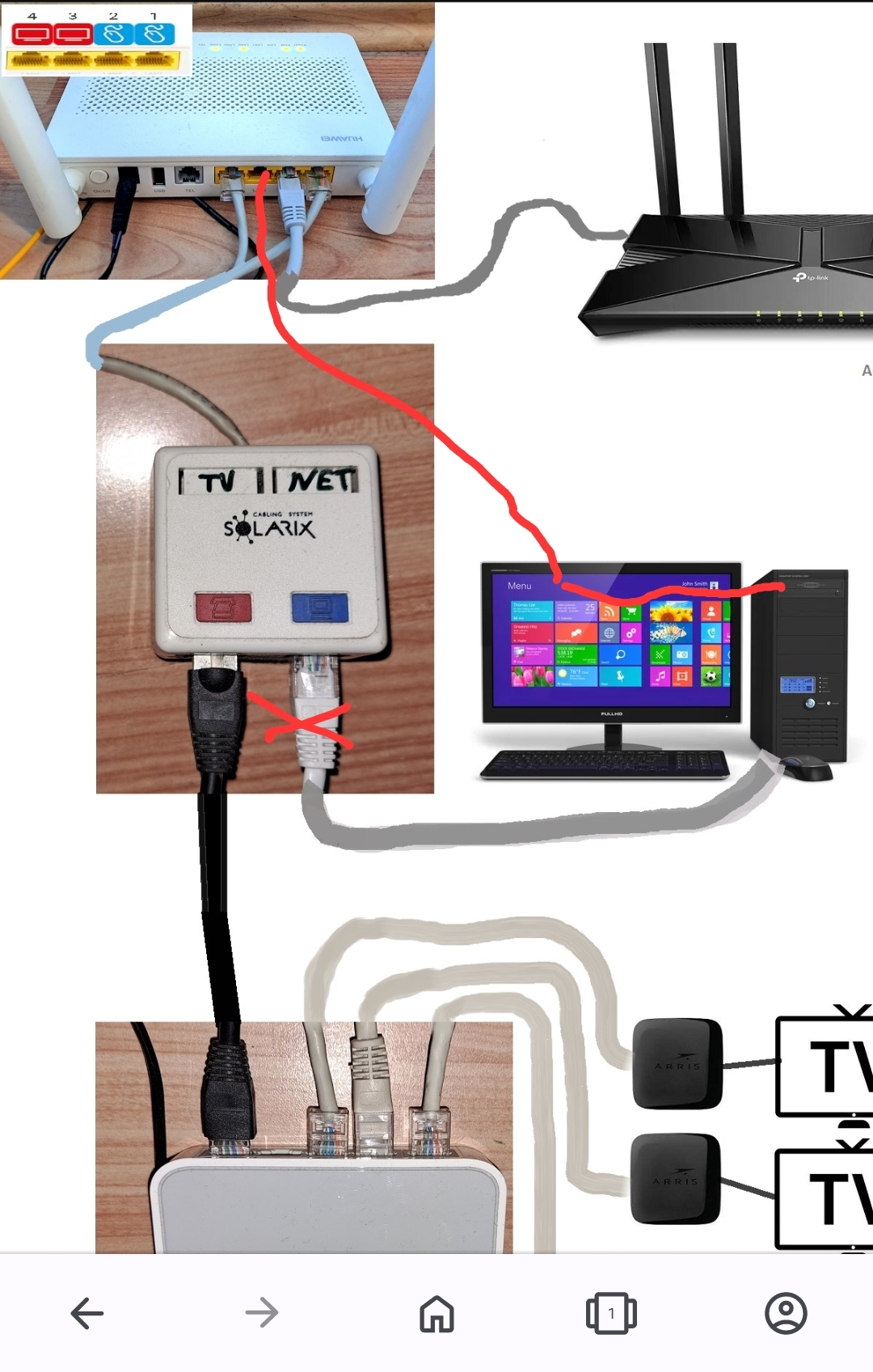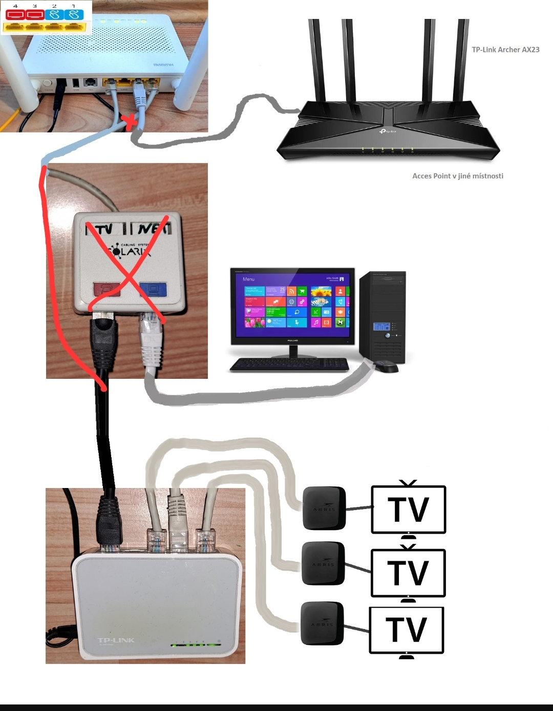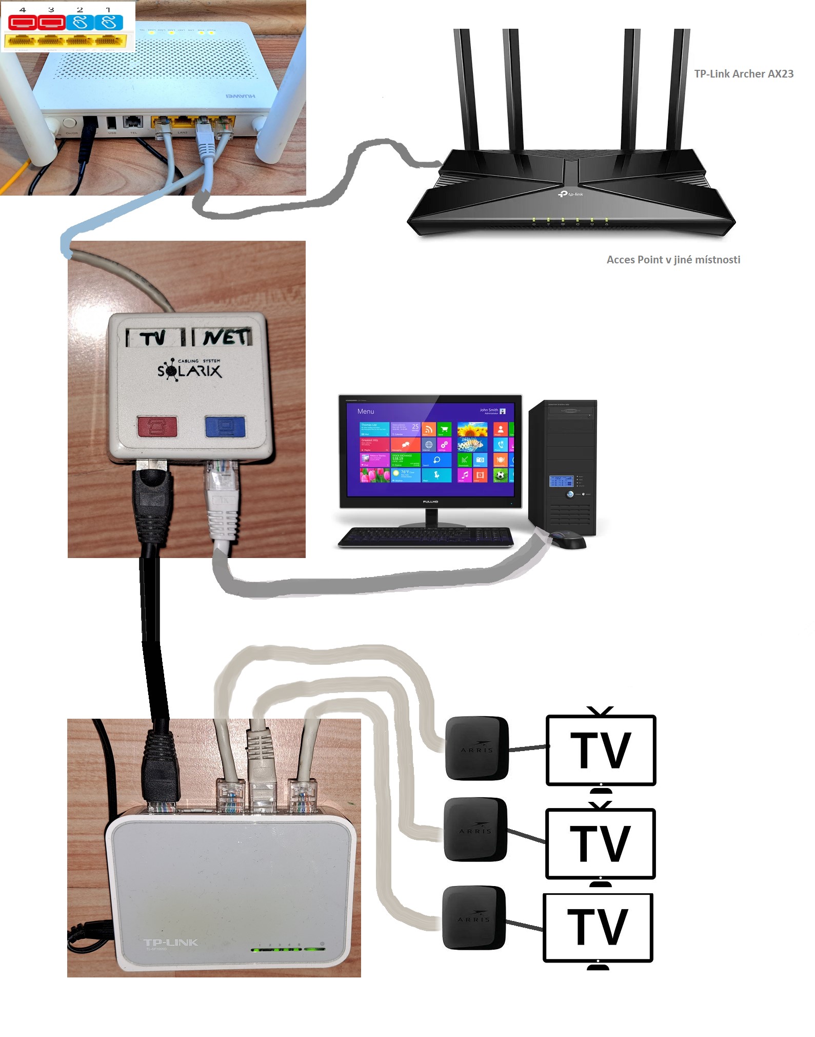Druhý router TP-LINK AX23 je v režimu AP pro pokrytí WiFi a ta tajemná krabička Solarix není brána, ale rozděluje jeden LAN kabel na dvě zásuvky RJ45.