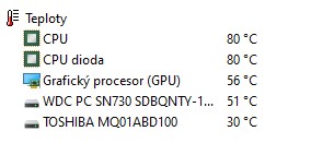 Ve správci úloh v režimu kdy nic neběži je rychlost CPU stále nad 3GHz, ve win 10 za stejných podmínek byla podstatně nižší, tzn. ntb se tolik nehřál. Standardně je teď teplota v rozmezí 80 - 90°C. Chladič vyčištěn, nanesena nová pasta na procesor, to vedlo ke snížení teploty z včerejších 95°C na současných cca 85°C.