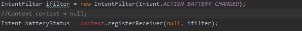 Intent batteryStatus = context.registerReceiver(null, ifilter);