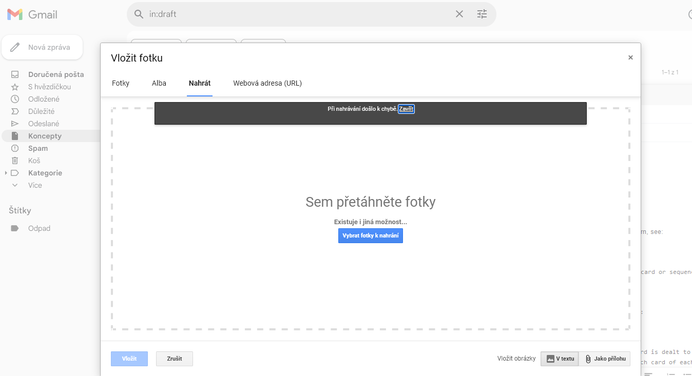Včera i dnes jsem se setkal u Gmailu s problémem, že jsem nebyl schopen do mailu vložit obrázek/screenshot v *png. Ani tažením myší, ani výběrem z adresáře.