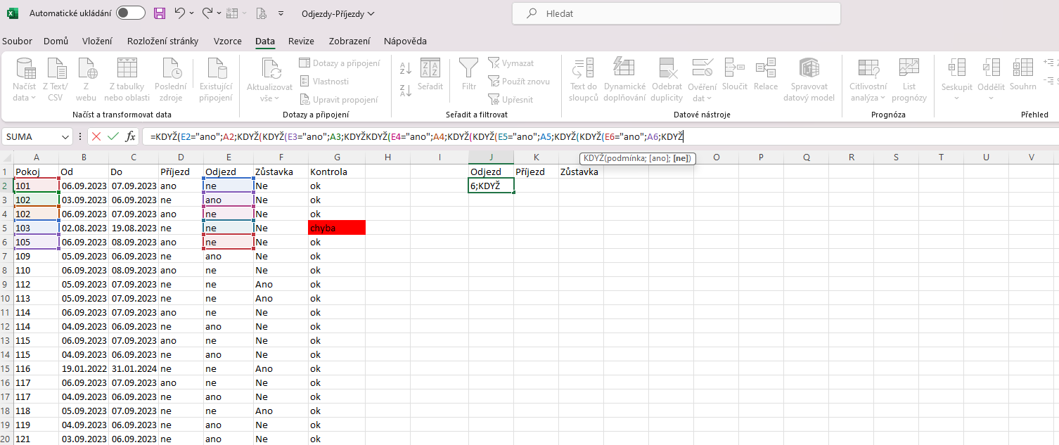 Jak je na obrázku, mám tabulku s daty s příjezdy a odjezdy jednotlivých pokojů, tyto data se každý den aktualizují(na základě exportovaného excel souboru z ubytovávacího softwaru) a mění a já potřebuji aby se mi z té tabulky co je na obrázku na základě vrácených hodnot vytvořila tabulka nová
