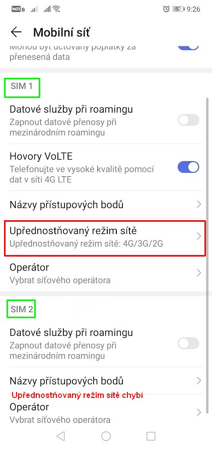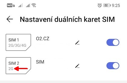 řeším problém s mobilem Huawei P20 Lite (stařeček, já vím), Android 9, po vložení druhé SIMkarty nabízí datové připojení pouze 2G. Nikde jsem nenašel možnost, jak to změnit? Foto v příloze.