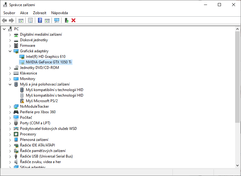 správce zařízení ukazuje, co vidí z hlediska desky. když je teď grafika zašedlá, je odpojená z desky…
