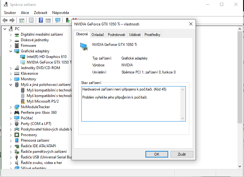 Tak jsem úspěšně resetoval. Obraz už naběhne, ale mám strach že to odnesla grafická karta. Nevidím ji ve správci zařízení a stáhl jsem si program TechPowerUp GPU-Z co jsem našel na netu a ten ji taky nedetekoval. Lze s tím něco dělat, nebo se mám smířit s tím, že je po ní? Děkuji za dosavadní pomoc :)