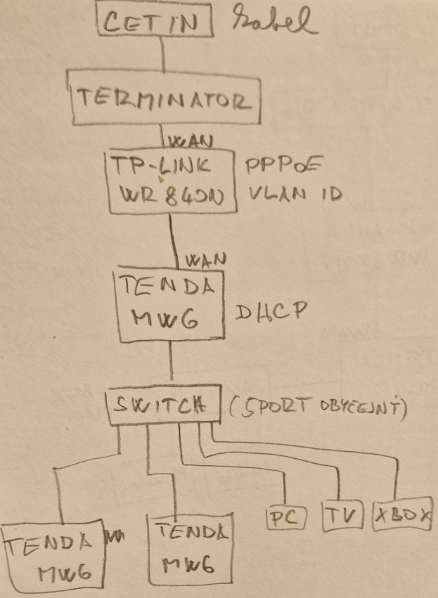 Zdravím, nově mám připojení k internetu přes kabel od Cetinu, tarif od nej.cz. Rychlost 60Mb/s. Za terminátorem mám router TP-LINK WR840N (zapojeno do WAN). Na něm je nastaveno PPPoE a VLAN ID podle operátora. WIFI je na něm vypnuté. Pak jdu kabelem viz nákres v příloze. Problém je, že mám poloviční rychlost na všem za Tendou. Když Tendu přepnu z DHCP na Můstek, tak je rychlost na wifi zařízeních OK, ale zařízení za switchem (TV,XBOX...) nedostanou IP. Chtěl bych vypnout DHCP na TP-LINKU, ale nevím jak přesně. Když na TP-LINKU nastavím DHCP na disable, inernet nikde nejde. Díky za pomoc. PS Tenda PPPoE a VLAN ID neumí.