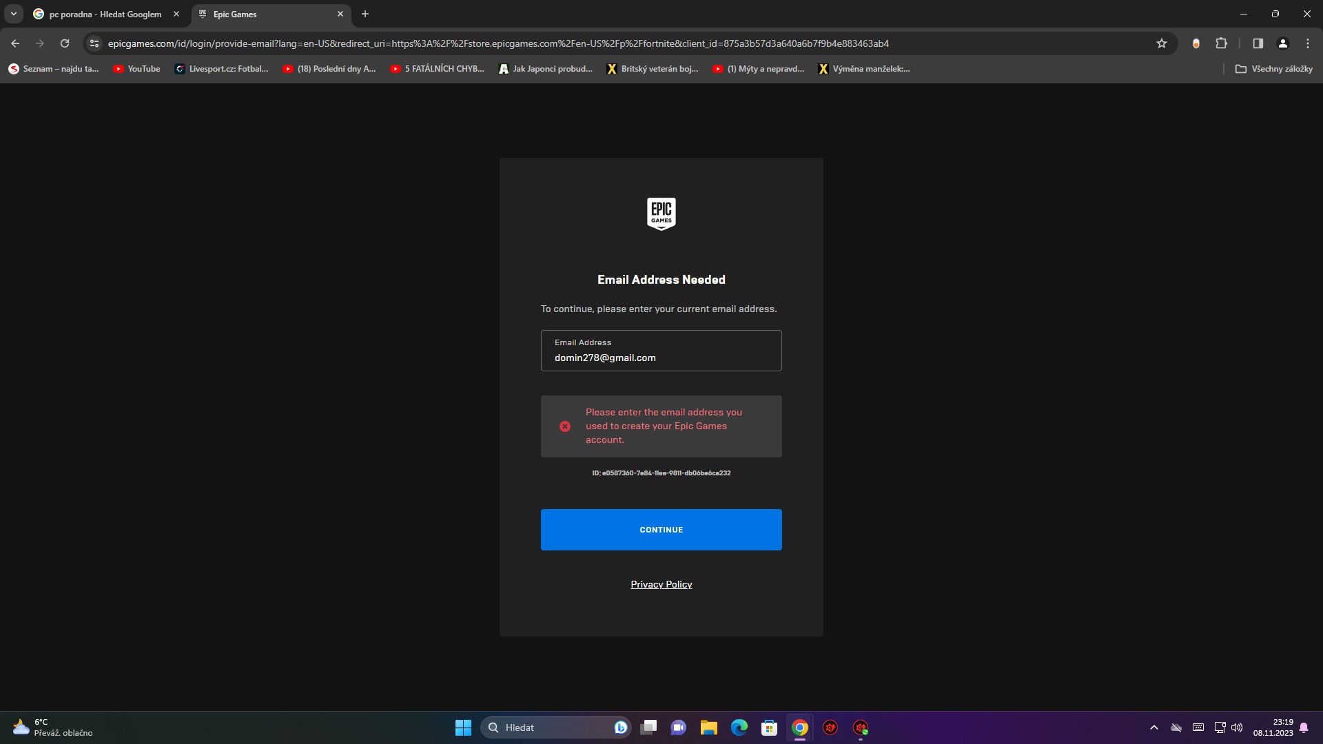 náhodou zkusím, jestli jste se nesetkali s tímhle problémem. Hraju Fortnite na PS5, chtěl jsem se na svůj účet přihlásit na PC přes Epic Games. Vyskočí na mě hláška, viz příloha.