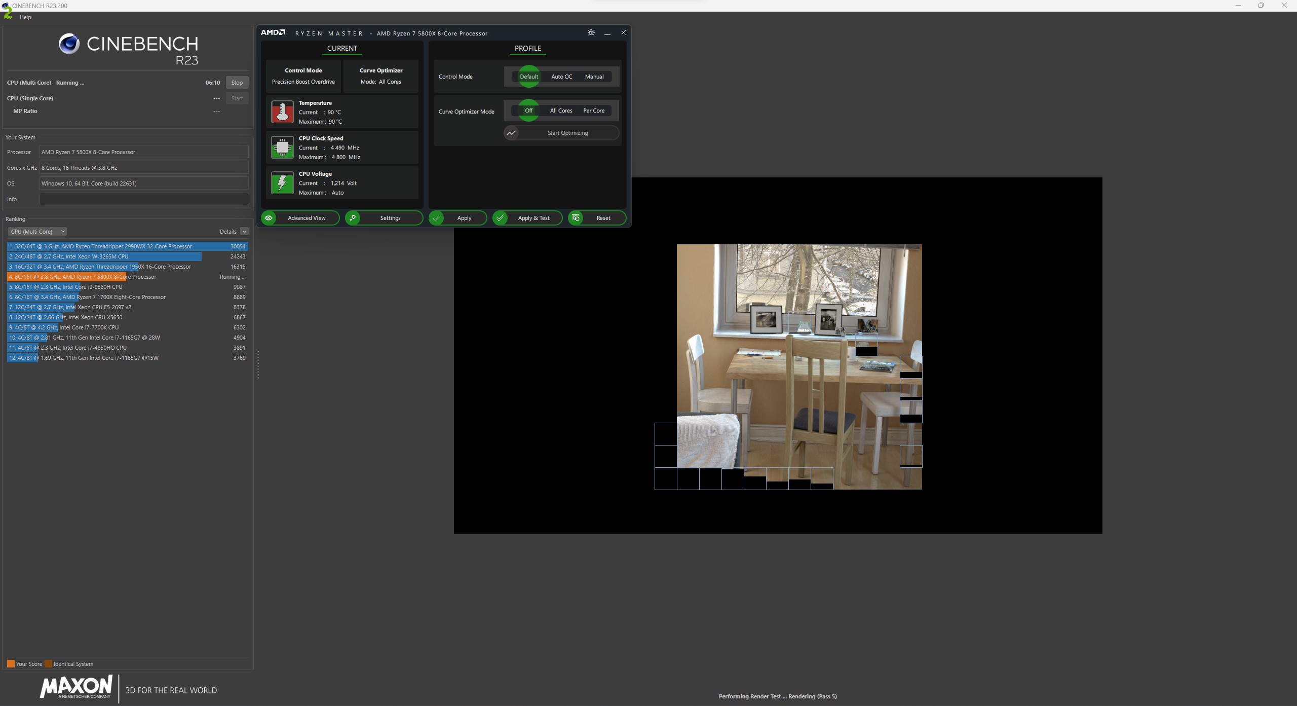 Další test byl v Cinebench s nastavením krivky v biosu na negative 10 a také 90°C