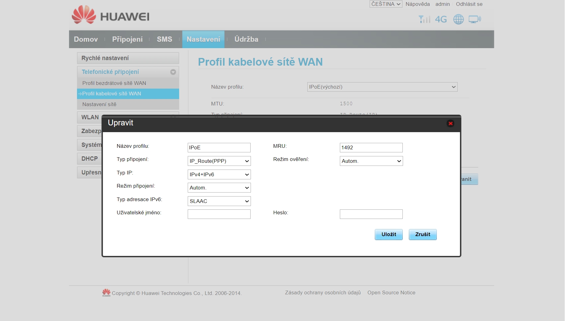 Zjistil jsem, že LTE modem/router Huawei B890 má také WAN vstup a dokonce i nastavení iP_Route (PPP), kdy tam lze zadat login a heslo, ale nevím, jestli to umí i nastavit VLAN. Je tam nějaká položka MRU, o které nevím, co znamená, viz screenshot. Není to ono?