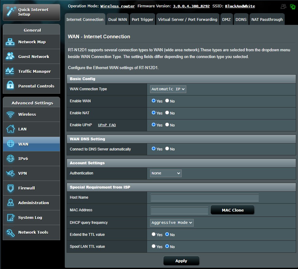 Ve WAN connection type? Já fakt co se těchto věcí se v tom vůbec nevyznám. Takže se na mě musí hodně po lopatě. IP adresy a tyhle věci jsou pro mě jinej vesmír.