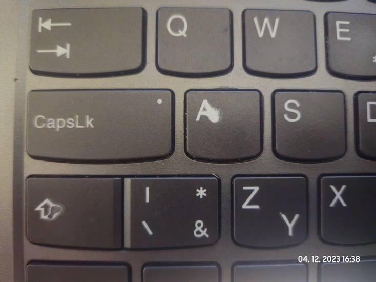 Teď jsem to obtáhnul obyčejným CD popisovačem a přelepil klávesu černou elektrikářskou páskou s tím, že u A se mi povedl vystřihnout poměrně pěkný trojúhelník a u S jsem vystříhl obdélníček v místě písmena, byla to piplačka. Zatím to několik dní drží, uvidim jak dlouho. Elektrikářská páska vůbec není cítit na prstu, že tam je navíc.