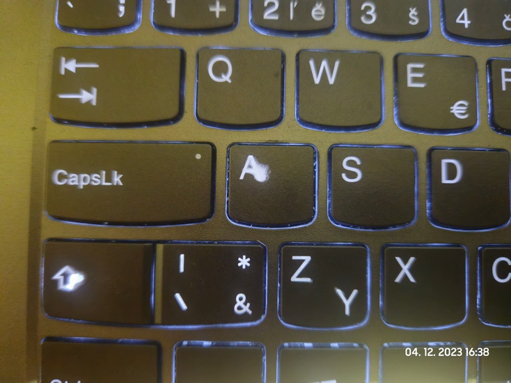 Klavesnica Lenovo po cca 2 rokoch, vypnute a zapnute podsvietenie, na Shifte vidiet ze to bude cele priesvitne a len zapatlane farbou do tvaru pismena . . .