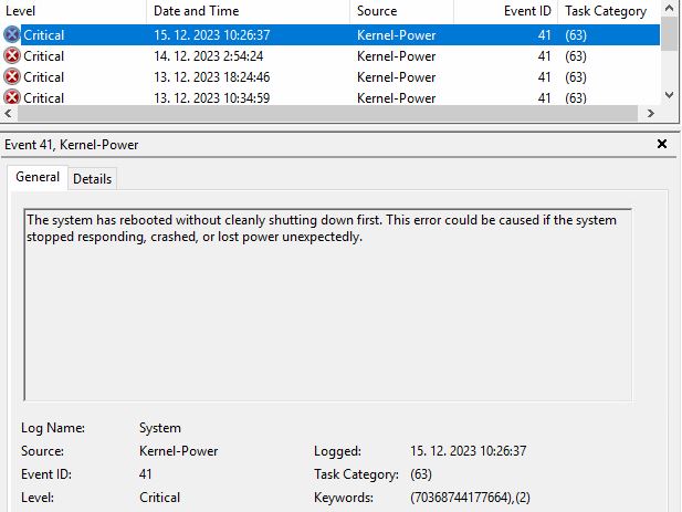 Vypisovat sem detaily "chyby" Kernel Power 41 bylo zbytečné - v podstatě jde jen o hlášení systému při jeho startu, že předešlý běh nebyl korektně ukončen.