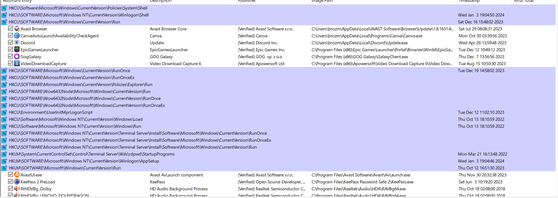 v ms autoruns jsou zajímavé záložky: logon (po spuštění), services (služby cizích výrobců), scheduled tasks (naplánované úlohy).