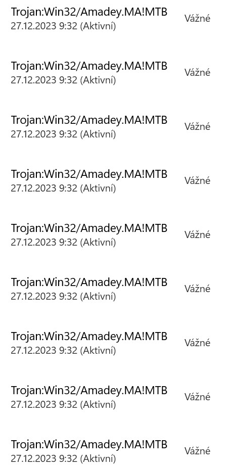 V počítači mám zřejmě virus Amadey. Zkoušel jsem projet počítač AdwCleaner, ESET Online Scaner i přímo Zabezpečení Windows. První dva programy hlásí, že je vše vyřešeno, ale když dám kontrolu v Zabezpečení Windows tak vždy najde virus viz. obr. Kliknu na tlačítko Spustit akce, aby dal virus do karantény. Po spuštění nové kontroly se ten samý virus objeví znovu. Jak se ho mám zbavit?