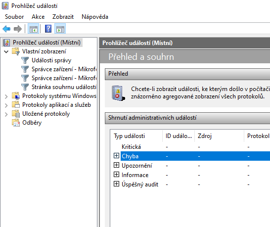 Prohlížeč události, v něm chyby nebo kritické chyby.
