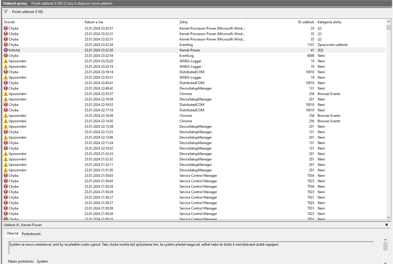 mas tam chyby devicesetupmanager, nejsou bezprostredne pred oznemenim o padu kernelu 41, ale projdi si vsechny.
