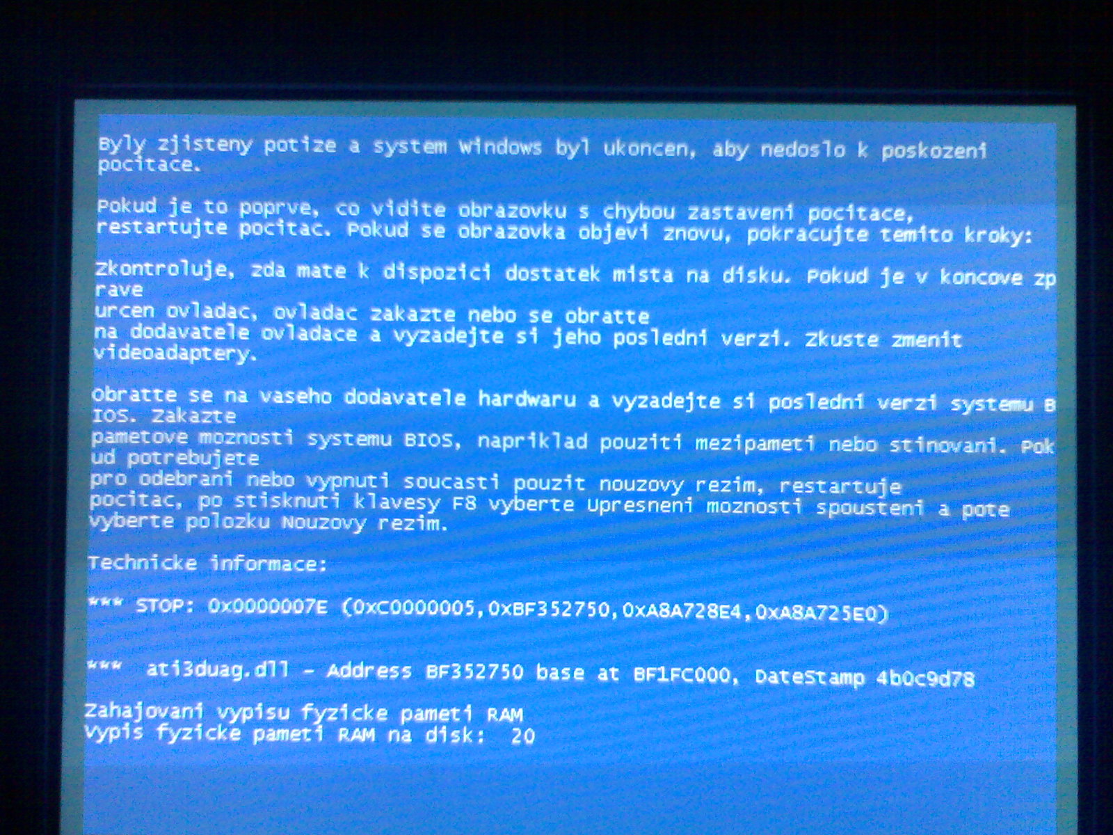 Dneska me to zaclo delat to stejne, nainstaloval jsem crysis warhead zapnu to a hned mi to hodilo bluescreen. Po restartnu mi nechtel najet ani system zkousel jsem XP i Win7 zaclo to nacitat a restart. Vypnul jsem na pul hodiny pc tedka sem ho zapnul a uz to zase jede,tak to chci co nejdriv vyresit. grafika HD 4670 ovladace nejnovejsi 9.12 zkousel jsem prein. porad to stejne.