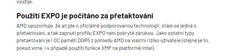 Dobrý den mám tyhle ramky a chtěl bych tam dát AMD expo profil v biosu, ale prý je to bráno jako přetaktování, a tak mě skončí záruka je to bezpečný? Ramky mají záruku 10 let, ale zase nechci jet na 4800 mhz základu, když moje deska podporuje až 8000 mhz, co by jste udělali vy? Zvláštní je, že amd udává expo profil jako automatické taktování, ale nechce to pokrýt zárukou, když ten profil vytvořili.
