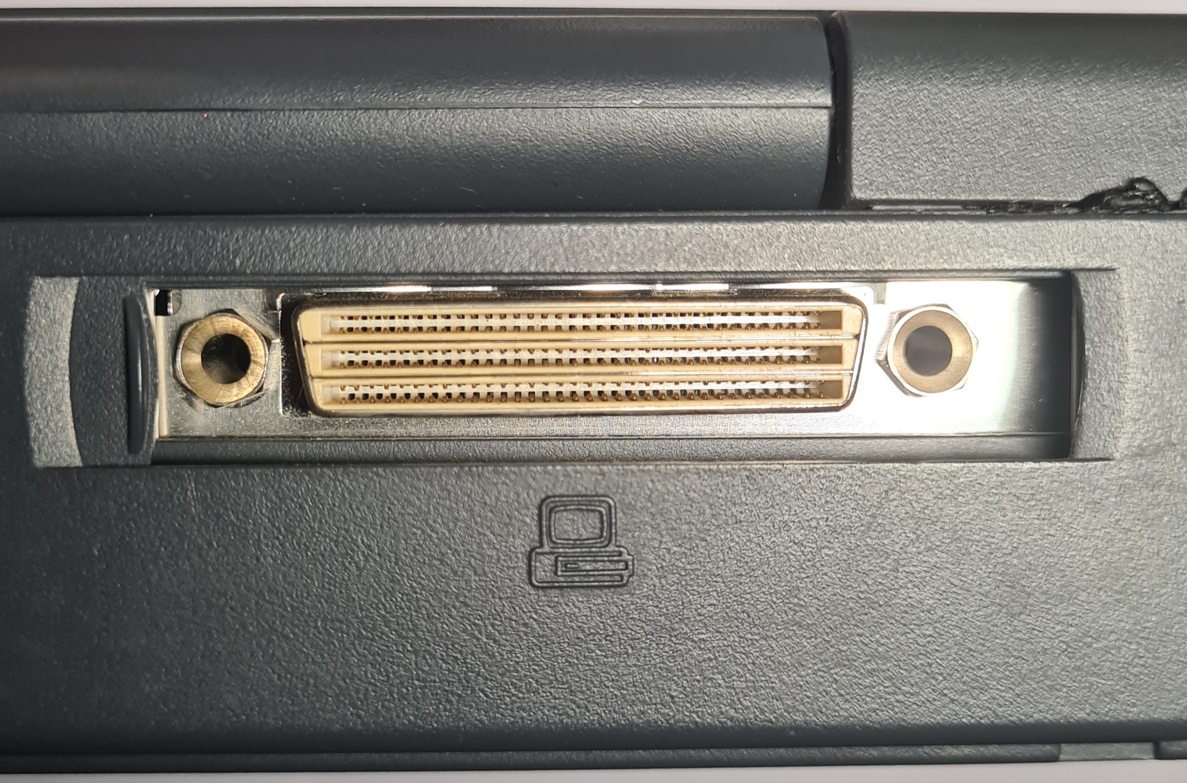 Má tedy PCMCIA, 1x COM, 1x LPT a Floppy. Tím to končí. Tedy má ještě cosi (viz foto), co nevím co je. Asi dok? Žádná CD mechanika ani USB. Je to Lebook Premium a ma to Pentium MMX 166 MHz. Víc jsem k tomu nenašel.