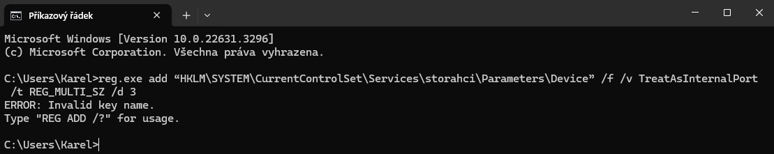 Děláš špatně to, že sis ten příkaz nezkopíroval celý. Byť je teda v české verzi špatně, ale to by byl zase jiný problém.