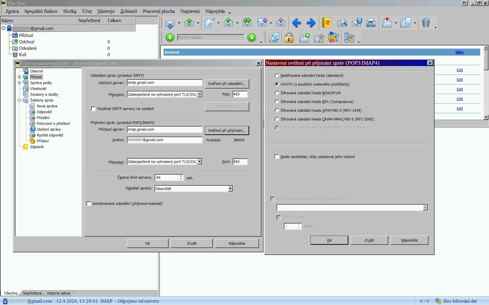 Niže LOG The Bat! v9.1.15; nemohl jsem si nevšimnout v LOGu níže "metoda: "XOAUTH2", přestože Then Bat! má nastaveno "Nešifrované odeslání hesla (standard)", Hm, PROČ, je to divé / něco je špatně.