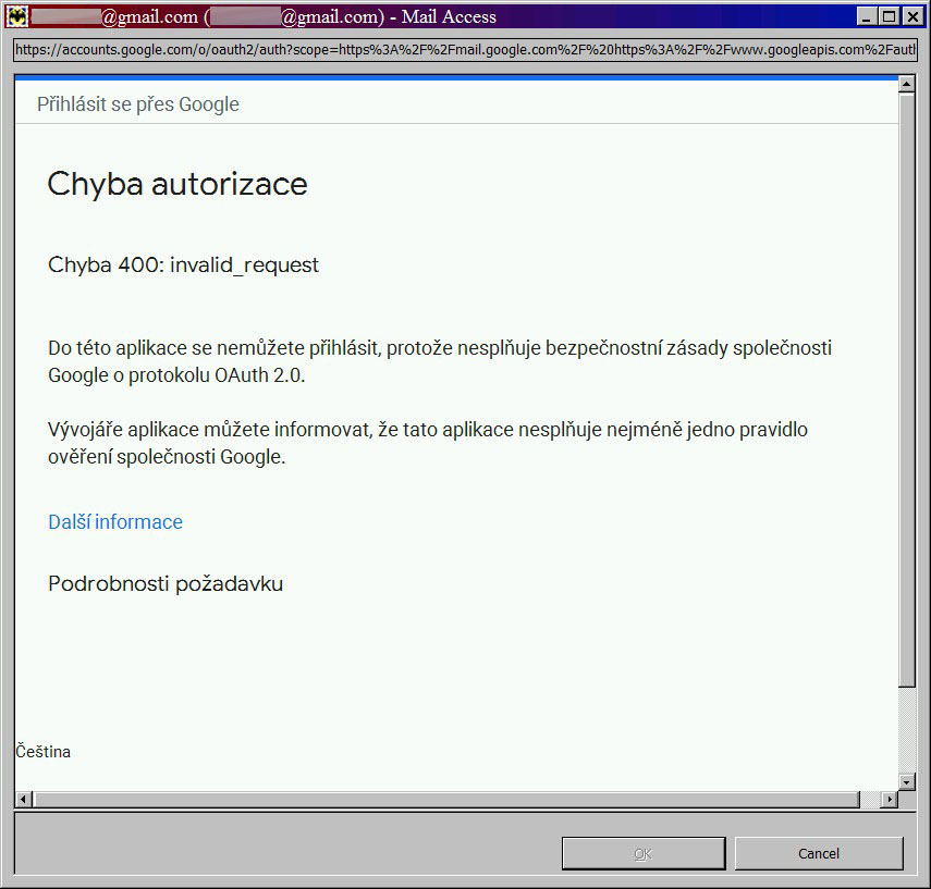 15.4.2024, 20:45:38: IMAP - Ověřování přístupu k IMAP serveru (uživatel: "userXYZ@gmail.com", metoda: "XOAUTH2")...