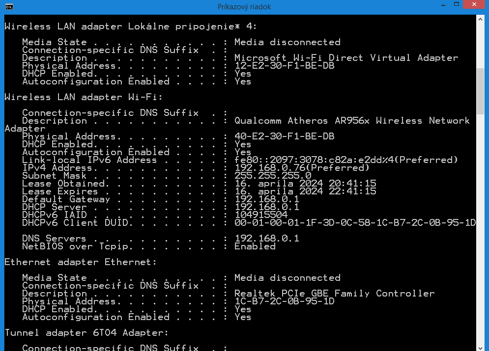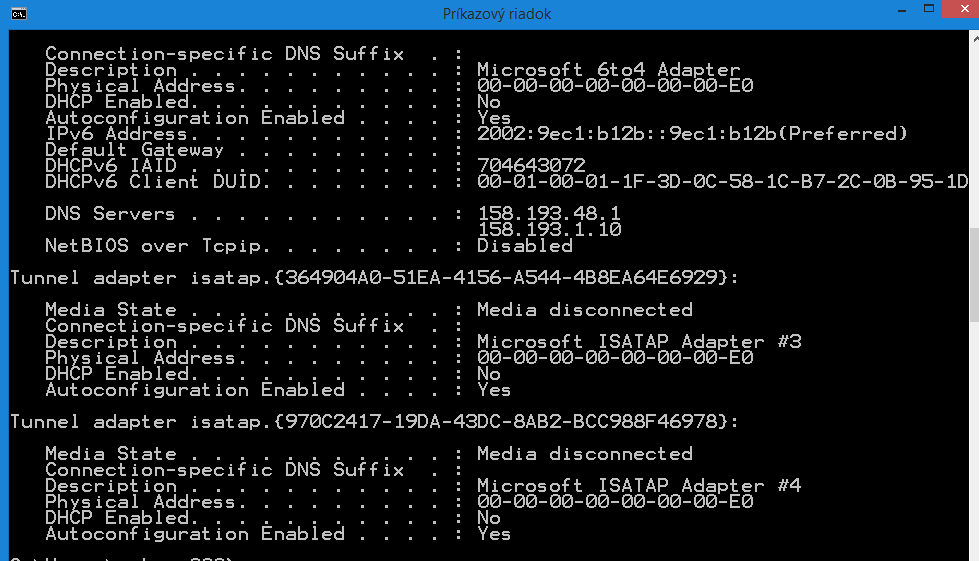 Keby si hodil ten vypis z ipconfig, co som pisal vyssie mohol si to uz mat vyriesene.