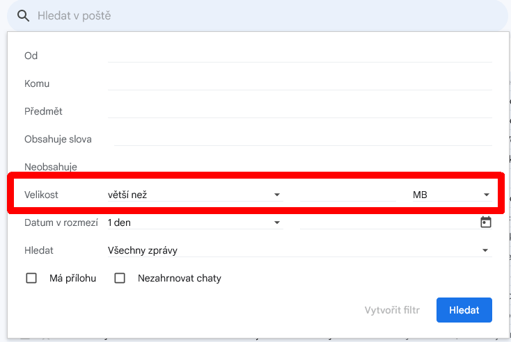 Nebo do vyhledávacího pole nahoře vlož (has:attachment OR has:drive) has:attachment larger:5M pro 5MB atd, a dál můžeš nahoře selektivně třídit pdf, obrázek, od koho atd.