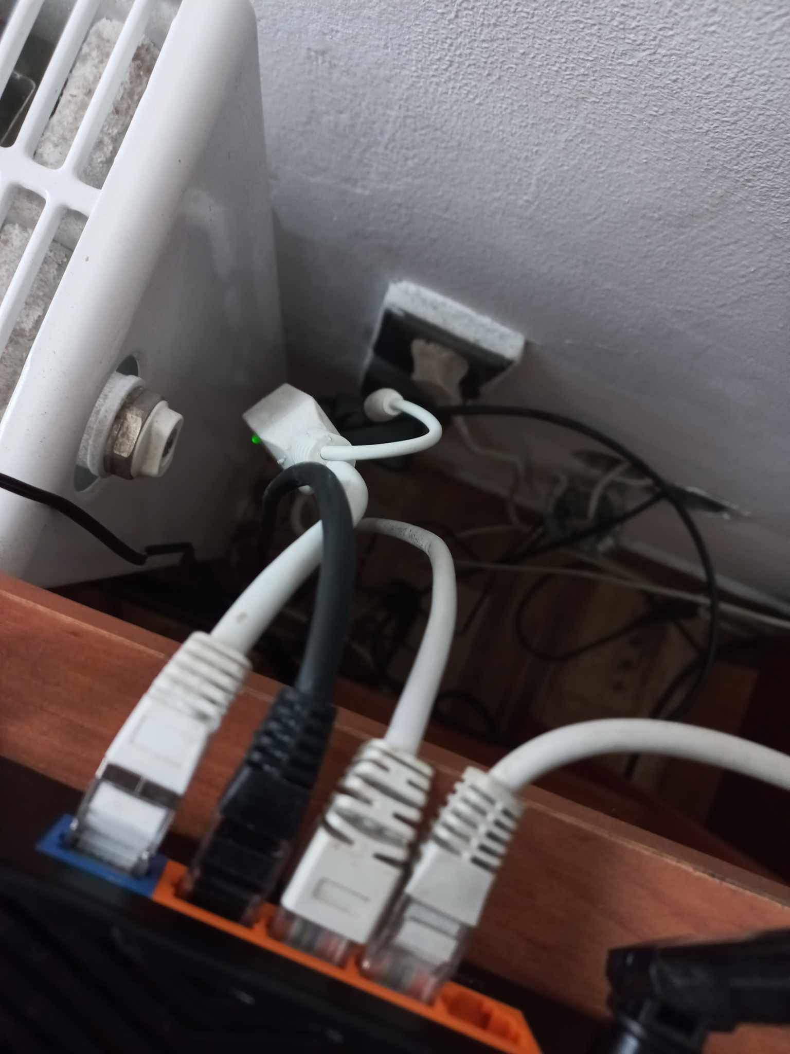 Na střeše je kulatý vysílač(vypadá jako satelit) -> ten vede dolů kabelem do routeru(mikrotit poe). Z routeru vede ethernet kabel do mého PC.