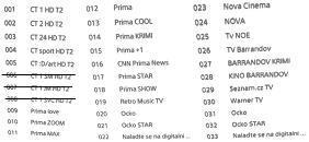 Seznam kanálů získávám přes TV kartu v počítači, teď jsem byl v Itálii a zůstalo mi to tam ještě viset, tak zkouším screenshot, ale jde to i exportovat do xml nebo z toho webového rozhraní prostě kopírovat jako text. No soubor je příliš velký, má jen 2,76 mega (dlouhá nudle, protože těch kanálů je tam strašně moc) měl jsem za to, že sem jde dávat soubory do 5 mega. Tak jiný z čech, tehdy jsem dělal screenshot kvůli tomu zmatku u čt. A ten italský zkusím taky udělat jen z viditelné plochy a ne celou nudli (udělal jsem dva multiplexy).
