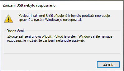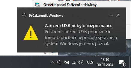 Jiný USB port jsem zkoušel, chová se to stejně, PC hned zareaguje na to, že bylo něco připojeno zvukem, po chvíli nahlásí, že USB nelze zobrazit...viz screenshoty. Překvapuje mě, že se jedná o tak max rok starý USB Flash disk, který se používal řekl bych minimálně a už by mělo být po něm.