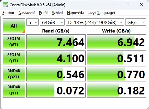 cdm: když podržíš myšoun nad zelenými poli, vypíše co je to za test. https://crystalmark.info/en/software/crystaldiskmark/crystaldiskmark-main-menu/