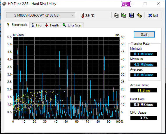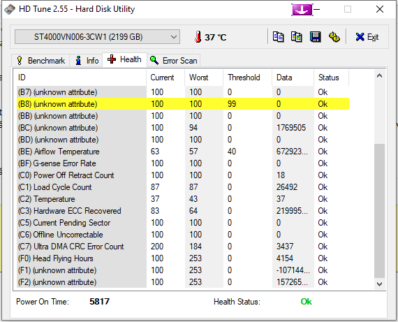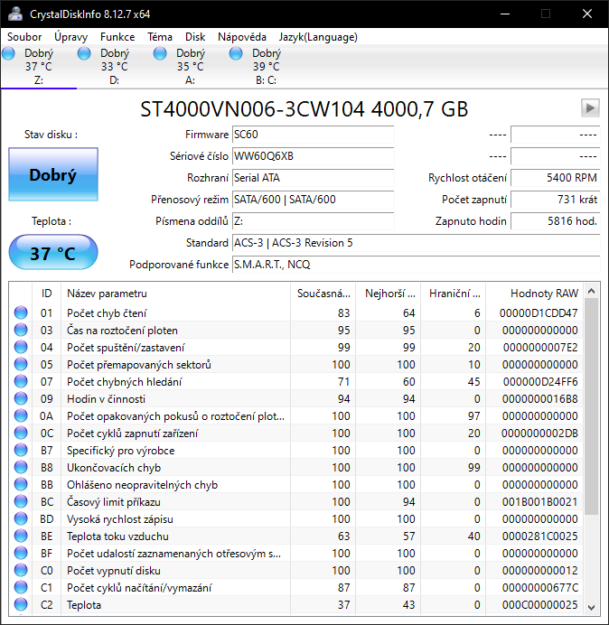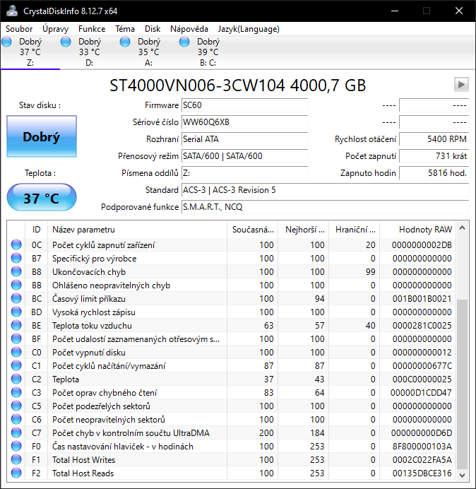 crystalinfo nehlásí nic, zkoušel jsem HD tune benchmark tam se v tom ale nevyznám a Error scan nejede pro jistotu vůbec, mám tam zálohu tak objednám klidně jiný a tenhle reklamuju jen chci vyzkoušet nějaký metody jestli není spíš vina na mojí straně jednou se mi taky stalo že ho crystalinfo neviděl vůbec ale průzkumník jo ale po otevření složky třeba filmů se ukázal error : bylo zadáno zařízení které neexistuje