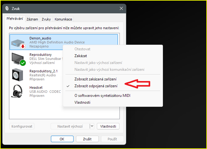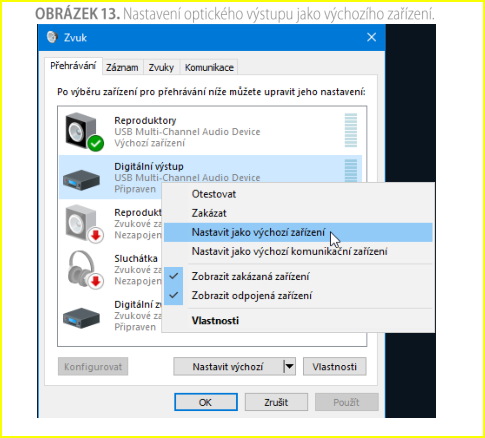 Ve výstupu mám pouze toto: Reproduktory USB Sound Device. (alespon tohle odkazuje na externí zvukovku. Jinak tam mám ještě Headphones Realtek(RAudio) a Speakers(RealtekRAudio).