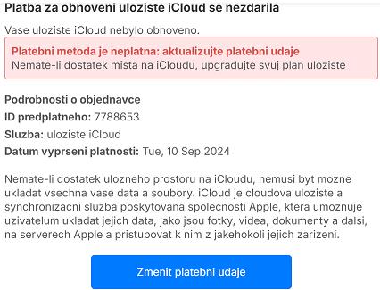 iCloud je vždy iCloud.com,bez ohladu ako je nastavené regionálne rozhranie systému,akurát text správ je vždy preložený do reči nastavenej v regionálnom nastavení systému,kedže iCloud je poskytovaný zdarma,nemá žiadne predplatitelské ID.....u icloud nedôjde k prekročeniu,to si apple dobre stráži a keď sa blíži k limitu,tak Apple pošle upozornenie o tom,že prihláste sa svojim apple ID k icloudu a uvolnite miesto vymazaním nepotrebných súborov a pozastaví nahrávanie ďalšieho obsahu.......až po prihlásení sa do icloudu cez platné apple ID sa objaví možnosť prejsť na platené iCloud+ a platí sa obvykle tak,že sa najprv deponujú prostriedky cez apple iD do apple store nastavenia užívatela a odtial sa platí predplatné,upozorňujúce maily na predplatné a na iné udalosti chodia vždy ako noreply@email.apple.com a pre Europu to vybavuje vždy pobočka Apple Distribution International Ltd. Hollyhill Industrial Estate,Hollyhill Cork Ireland,je to vždy takto zretelne označené aj s logom Apple.....K niektorým zariadeniam dostane užívatel Apple One službu s rôznou eval periodou (dá sa aktivovať a zakúpiť dodatočne aj k zariadeniam,kde to nieje dodávané ),tam je iCloud+ obsiahnutý štandardne,pokial to užívatel ukončí,alebo sa rozhodne ďalej pokračovať bez predplatného,iCloud+ sa ukončí a prepne na bezplatný iCloud...